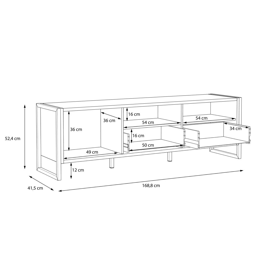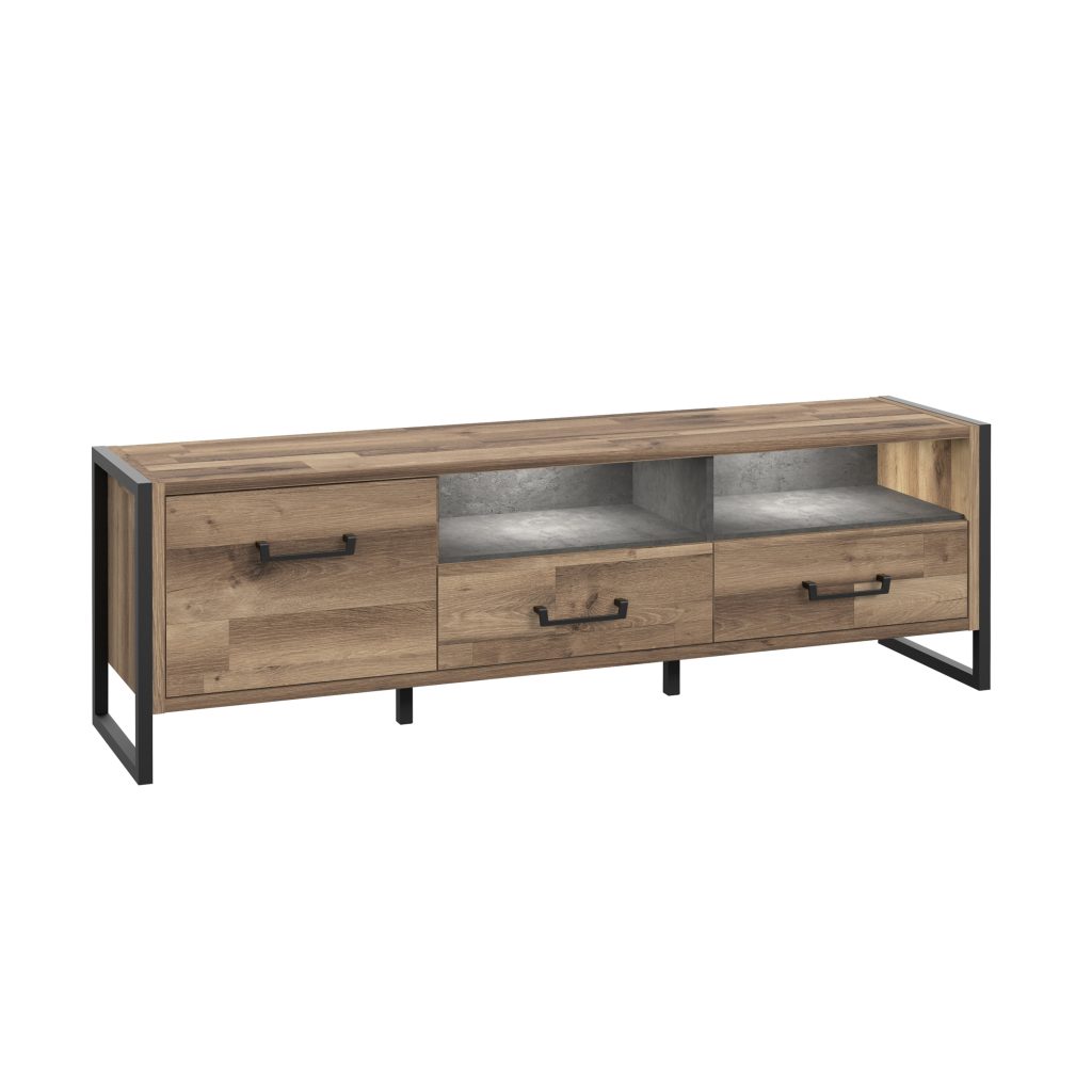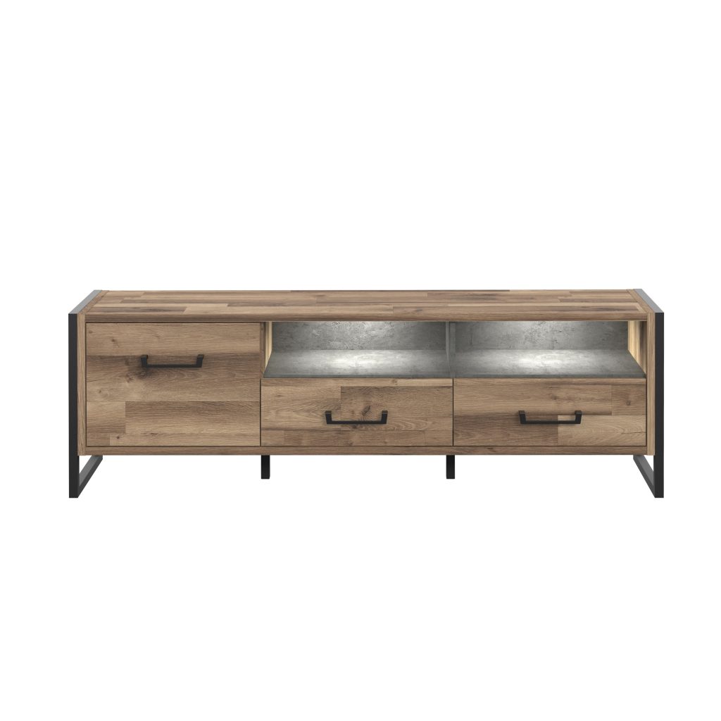 Funkcionalus vidinis išplanavimas leidžia patogiai laikyti įvairius daiktus – multimedijos įrangą, pultelius, kabelius ar kitus reikmenis. Uždari skyriai padeda paslėpti mažiau estetiškus elementus, o atviros vietos leidžia lengvai pasiekti dažniausiai naudojamus įrenginius.