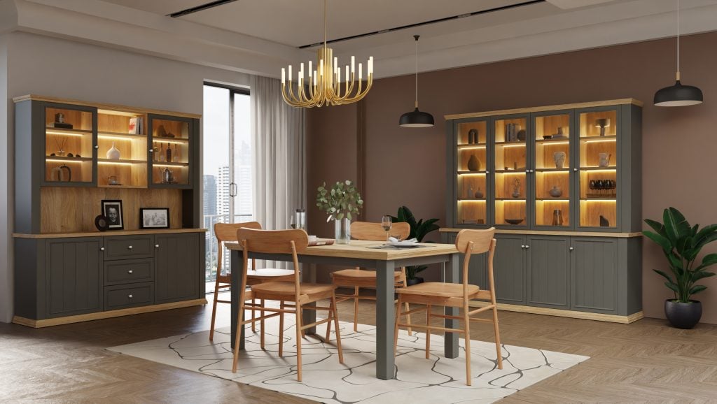 Komoda-indauja suteikia pakankamai vietos indams, stalo tekstilei, dokumentams ar kitiems kasdien naudojamiems daiktams laikyti. Uždari skyriai leidžia paslėpti rečiau naudojamus daiktus, o viršutinė dalis gali būti naudojama dekoratyviniams elementams – vazoms, nuotraukų rėmeliams ar stilingoms interjero detalėms – išdėstyti. Tai leidžia sukurti individualų ir jaukų erdvės akcentą.