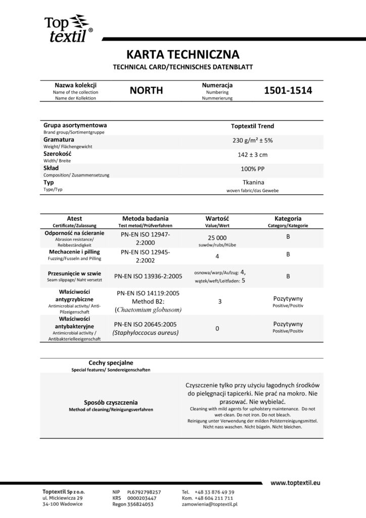 North-1503 audinys pasižymi malonia tekstūra ir ramiu, universaliu atspalviu. Spalva lengvai derinama su kitais baldais bei interjero detalėmis, todėl sofa-lova išlaiko estetišką ir tvarkingą išvaizdą net intensyviai naudojant. Audinys prisideda prie jaukios, kasdieniam poilsiui palankios namų atmosferos kūrimo.