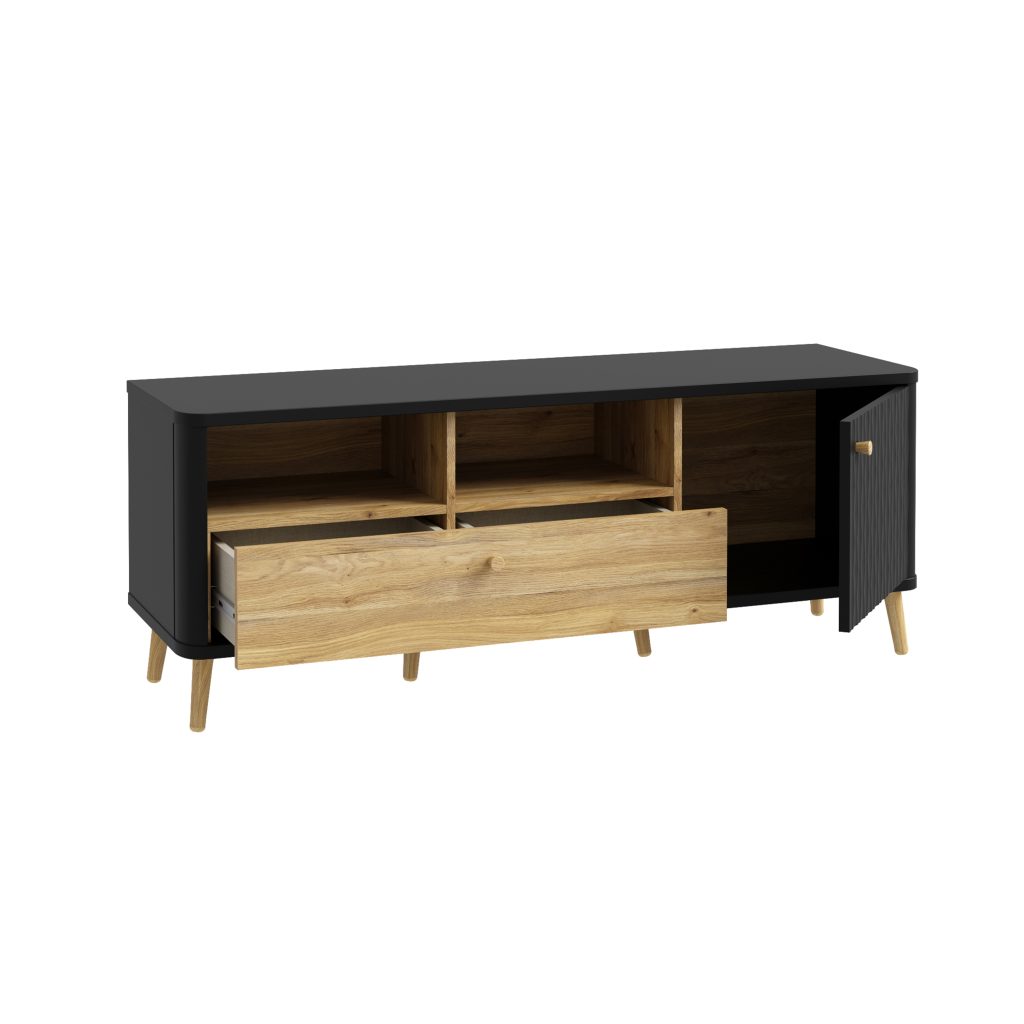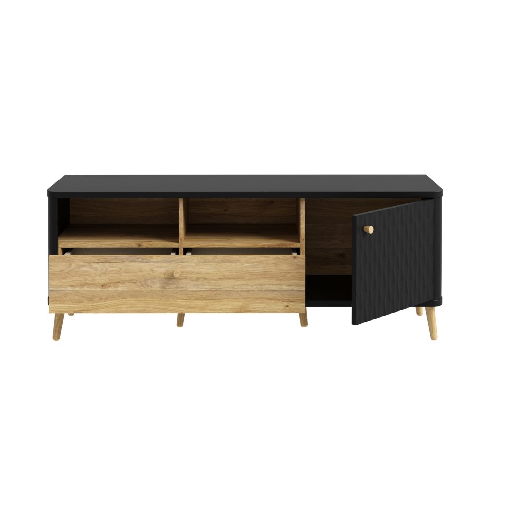 Komoda suteikia stabilų pagrindą televizoriui bei papildomą vietą multimedijos įrangai. Ant jos paviršiaus galima patogiai pastatyti televizorių, o vidiniuose skyriuose laikyti įvairius priedus – nuo dekoderių iki žaidimų konsolių ar kitų elektronikos įrenginių.