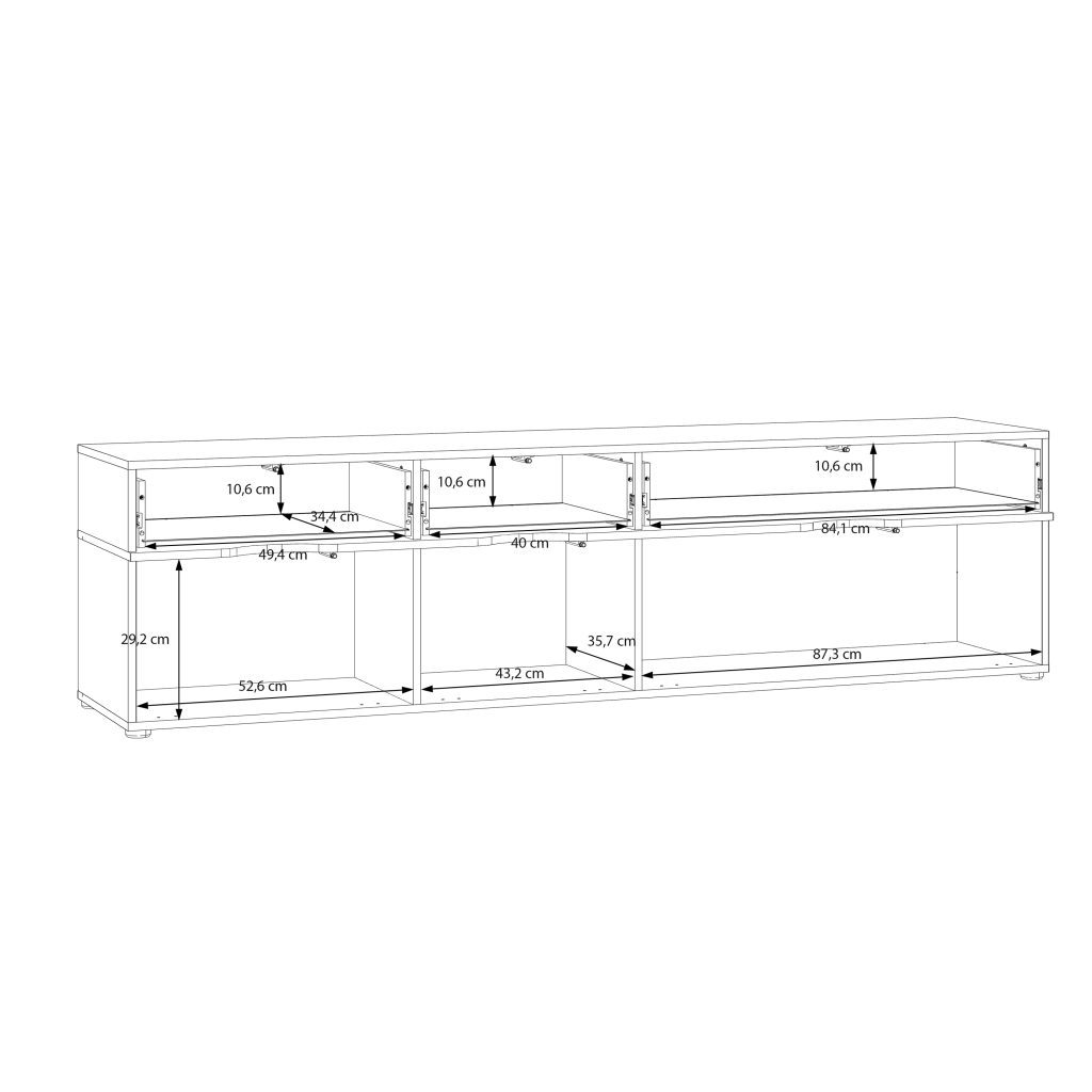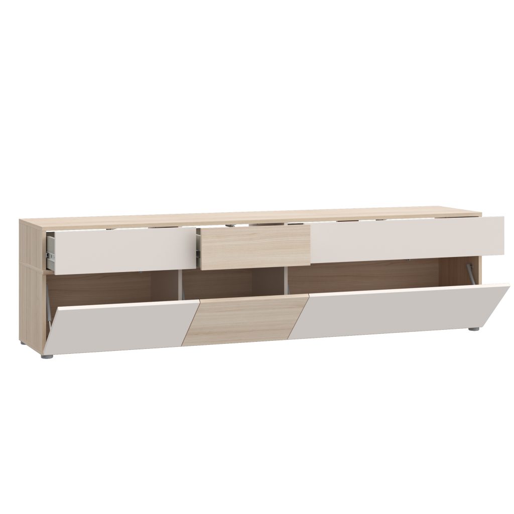 Komoda pasižymi praktišku ir patogiu išplanavimu. Ant plataus stalviršio galima stabiliai pastatyti televizorių, o vidiniuose skyriuose patogu laikyti įvairius multimedijos priedus – televizijos priedėlius, žaidimų konsoles, nuotolinio valdymo pultus ar kitus elektronikos įrenginius. Tai leidžia visus reikalingus daiktus laikyti vienoje vietoje ir palaikyti tvarką svetainėje.
