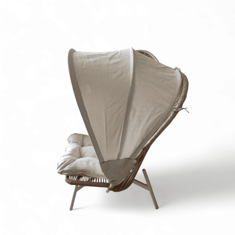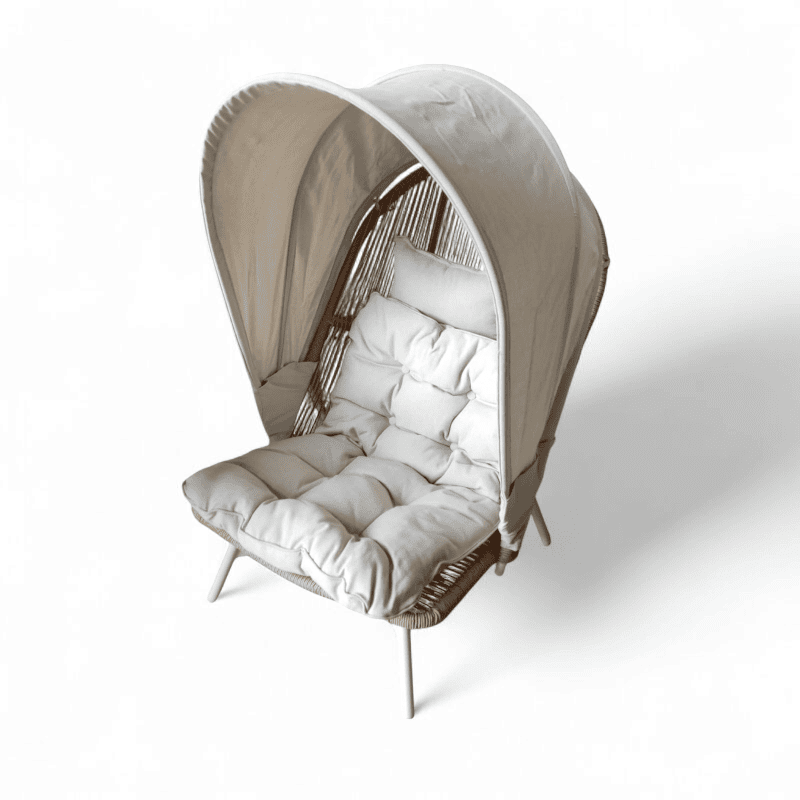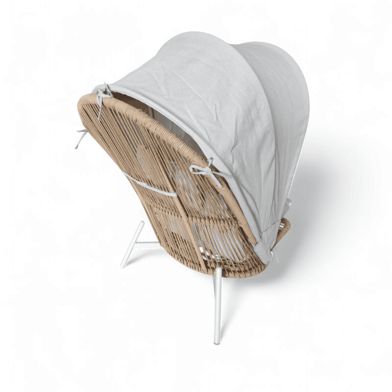 Didžiausias šio krėslo privalumas – integruotas stogelis, kuris suteikia apsaugą nuo tiesioginių saulės spindulių. Tai leidžia mėgautis poilsiu net ir saulėtomis dienomis, išlaikant komfortą ir malonią pavėsio zoną.