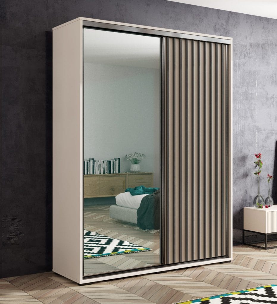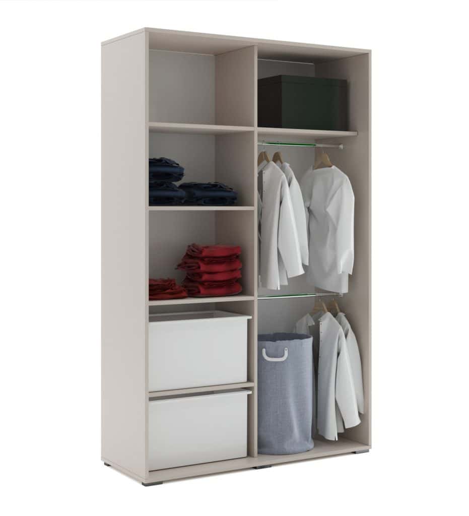 150 cm pločio spinta suteikia pakankamai erdvės patogiai organizuoti kasdien naudojamus daiktus. Vidinė struktūra leidžia efektyviai paskirstyti vietą – numatytos zonos pakabinamiems drabužiams, lentynos sulankstytiems rūbams, patalynei ar aksesuarams. Toks išplanavimas padeda palaikyti tvarką ir užtikrina patogų naudojimą kasdien.