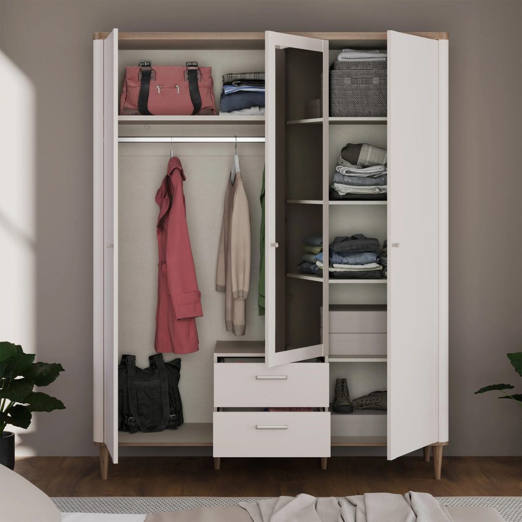 Vidaus išplanavimas pritaikytas patogiam daiktų laikymui. Spintoje galima tvarkingai susidėlioti drabužius, aksesuarus ar kitus buities reikmenis, todėl kasdienė rutina tampa paprastesnė ir sklandesnė. Gerai apgalvota konstrukcija leidžia optimaliai išnaudoti turimą erdvę ir palaikyti tvarką be papildomų pastangų.