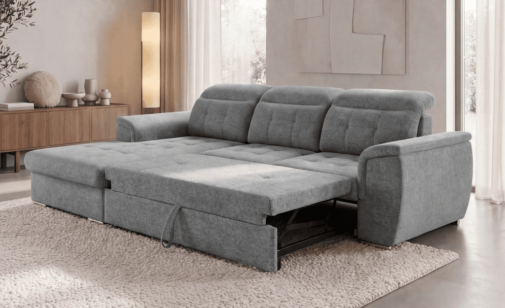 Kairinė kampo pusė leidžia baldą patogiai pritaikyti pagal kambario išplanavimą. Toks sprendimas suteikia daugiau lankstumo planuojant svetainės erdvę ir padeda sukurti patogų bei funkcionalų interjerą.