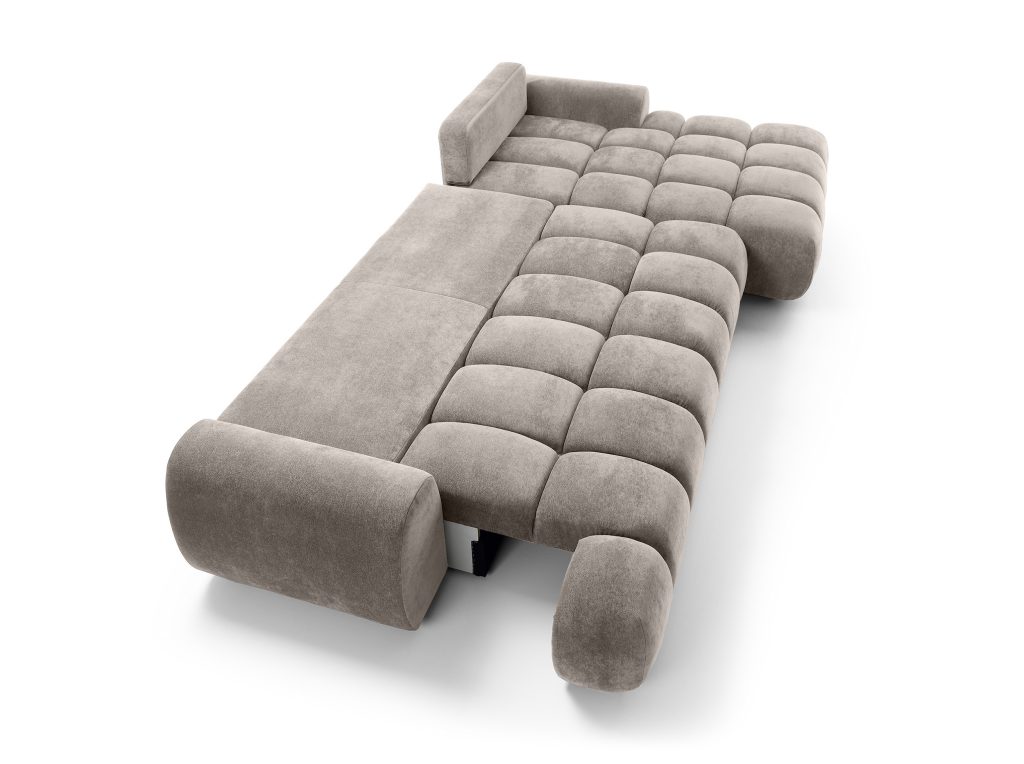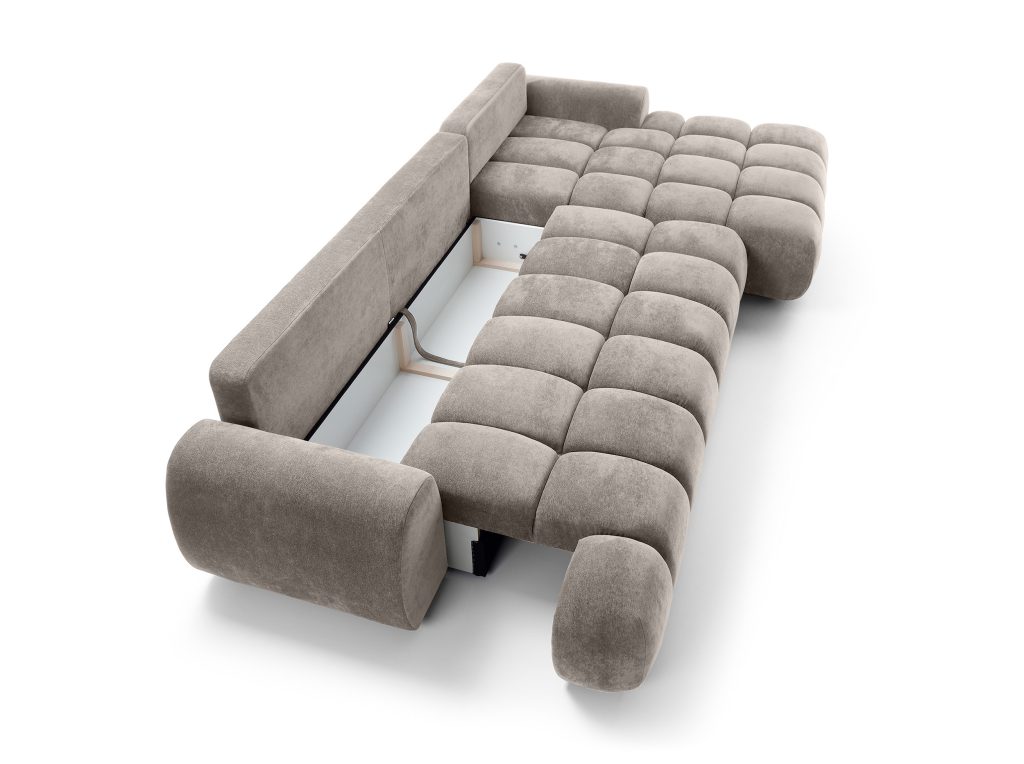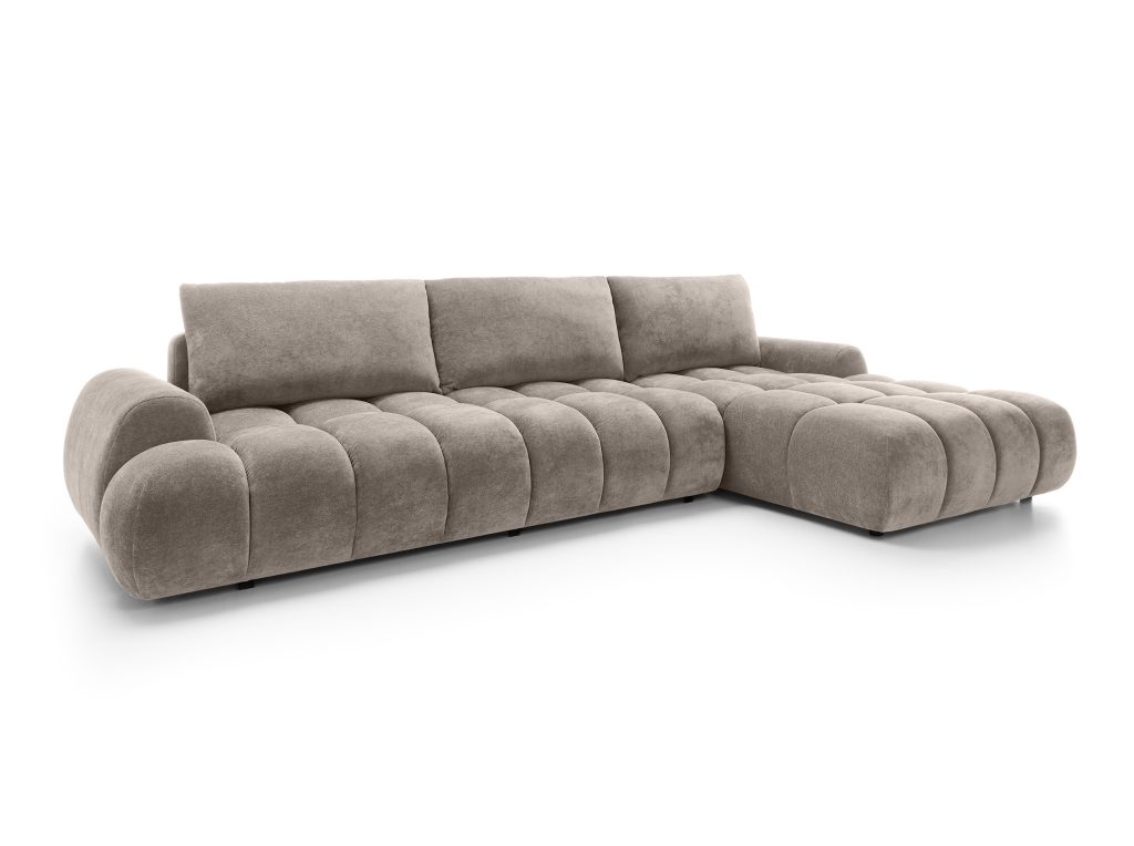 Minkštas kampas pasižymi patogia sėdėjimo zona, kuri tinka tiek trumpam poilsiui, tiek ilgesniam sėdėjimui. D formos (dešinės pusės) išdėstymas suteikia daugiau lankstumo planuojant baldų išdėstymą kambaryje ir leidžia lengvai priderinti kampą prie skirtingų patalpų išplanavimo sprendimų. Tai praktiškas pasirinkimas tiek erdvesnėms, tiek vidutinio dydžio svetainėms.