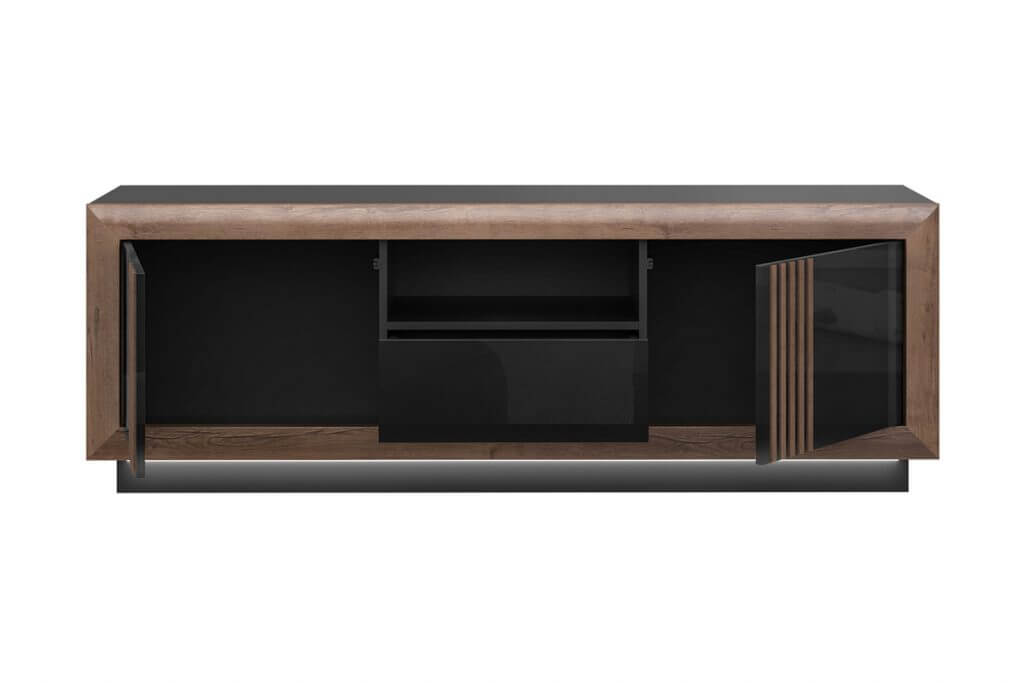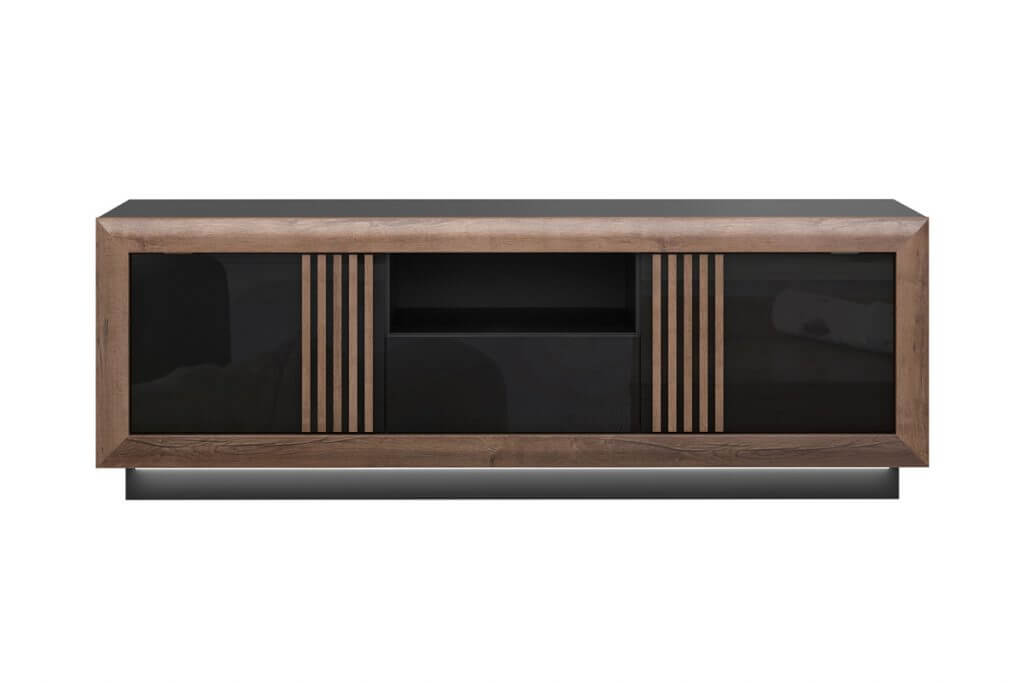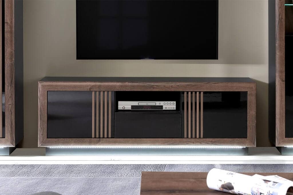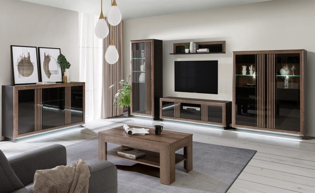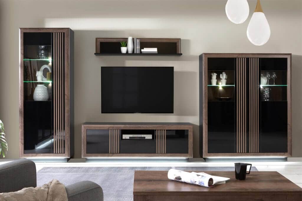 Prabanga dvelkianti svetainės baldų sistema – Savona. Vertikalios tamsinto ąžuolo spalvos juostelės, neįprastai puošia juodą blizgų fasadą. Sistema susideda iš svetainės staliuko, pakabinamos lentynos, taip pat vitrinų ir komodų, kuriose įmontuota „push to open“ atidarymo funkcija. Nepaisant to, kad baldai tamsūs, juos puikiai išryškina LED apšvietimas. Su kolekcija Savona susikursite prabangų interjerą savo namuose, kuris atsiskleis kiekvienoje baldų detalėje!