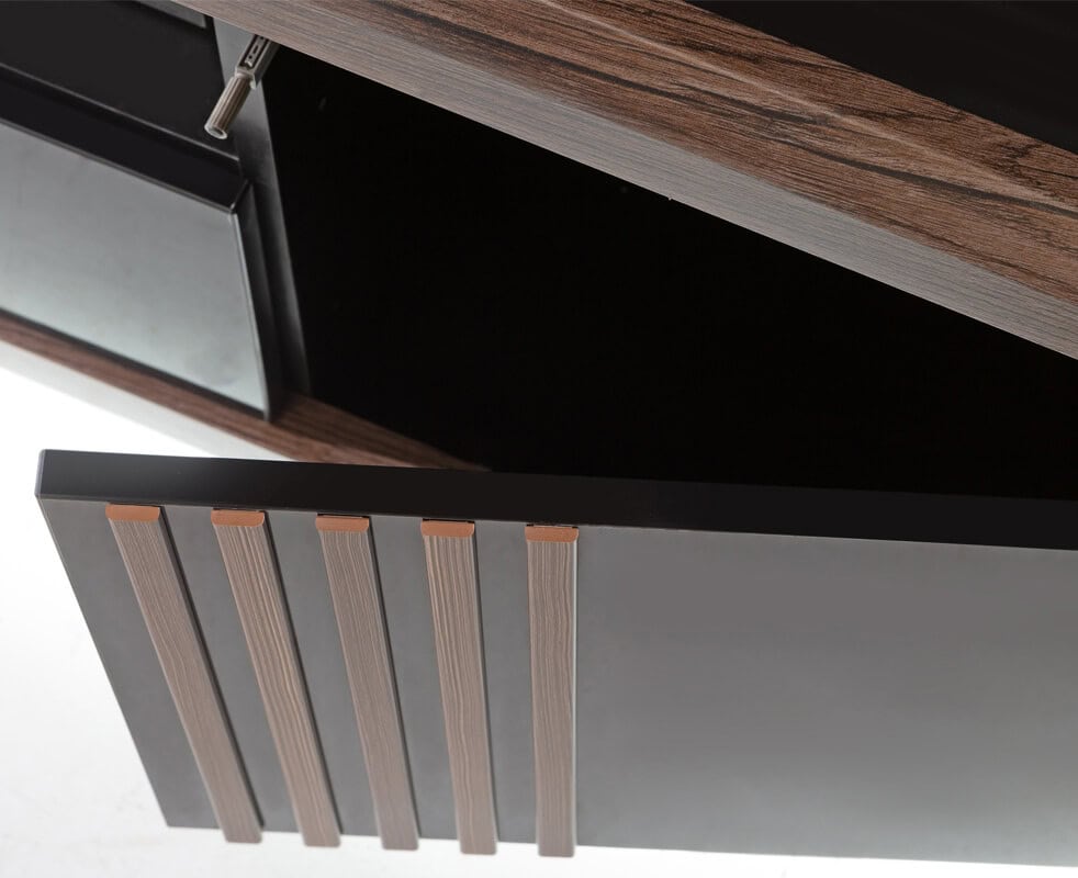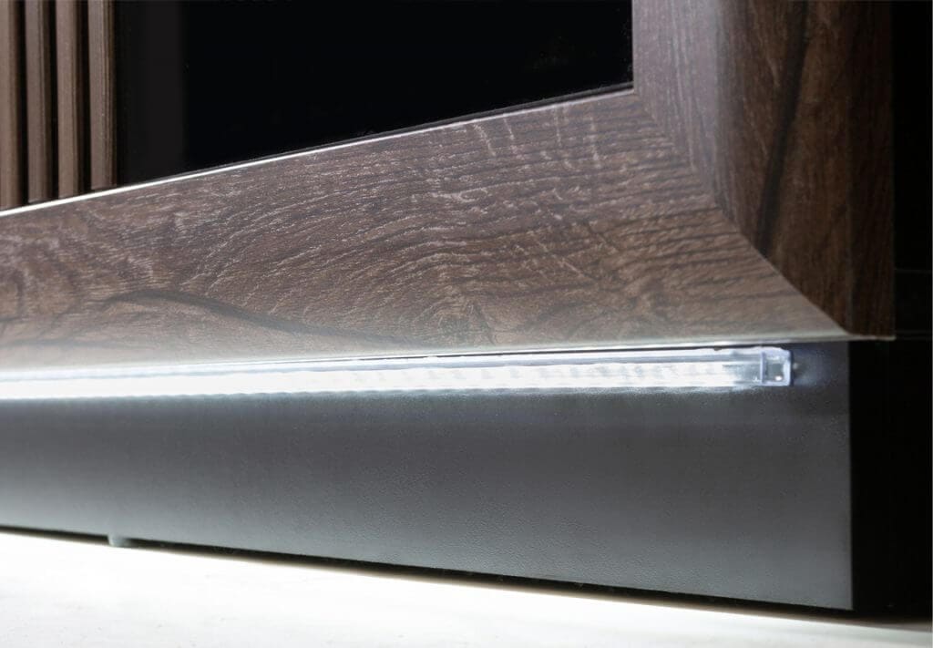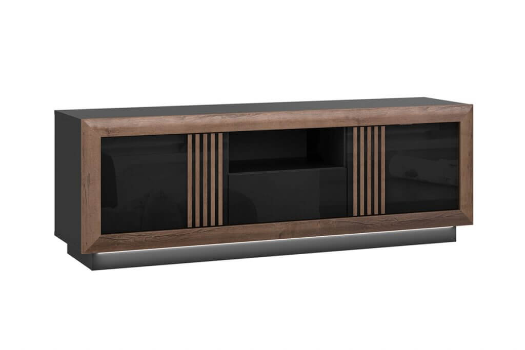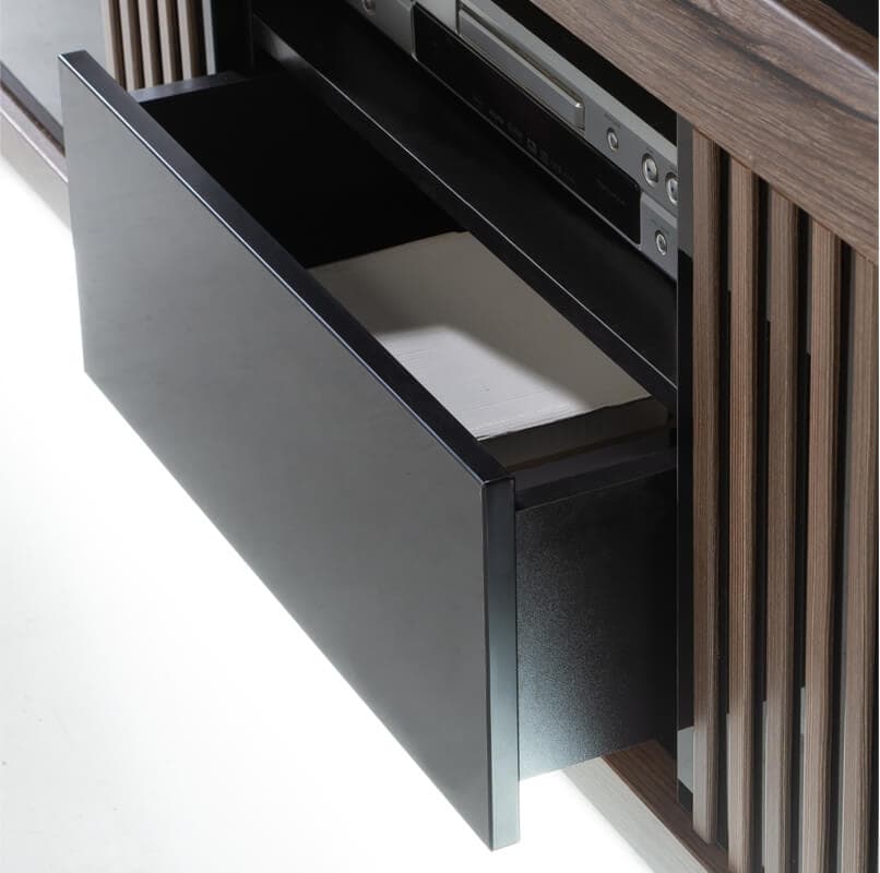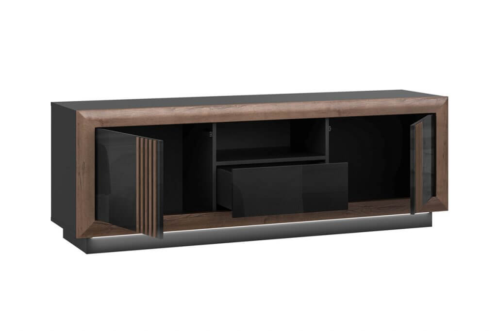 Prabanga dvelkianti svetainės baldų sistema – Savona. Vertikalios tamsinto ąžuolo spalvos juostelės, neįprastai puošia juodą blizgų fasadą. Sistema susideda iš svetainės staliuko, pakabinamos lentynos, taip pat vitrinų ir komodų, kuriose įmontuota „push to open“ atidarymo funkcija. Nepaisant to, kad baldai tamsūs, juos puikiai išryškina LED apšvietimas. Su kolekcija Savona susikursite prabangų interjerą savo namuose, kuris atsiskleis kiekvienoje baldų detalėje!