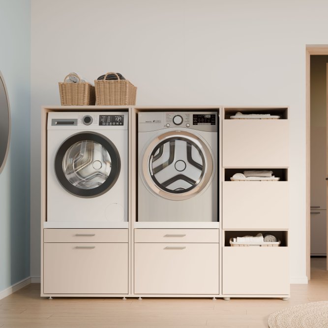 WASHCAB WCTO200-U71S pastatoma lentyna skalbimo mašinai pasižymi universaliu dizainu, todėl lengvai dera su įvairiais vonios ar skalbyklos interjero stiliais – nuo modernaus ir minimalistinio iki šiuolaikinio. Ji gali būti derinama su kitais WASHCAB kolekcijos baldais, sukuriant vientisą erdvę.